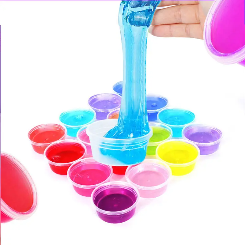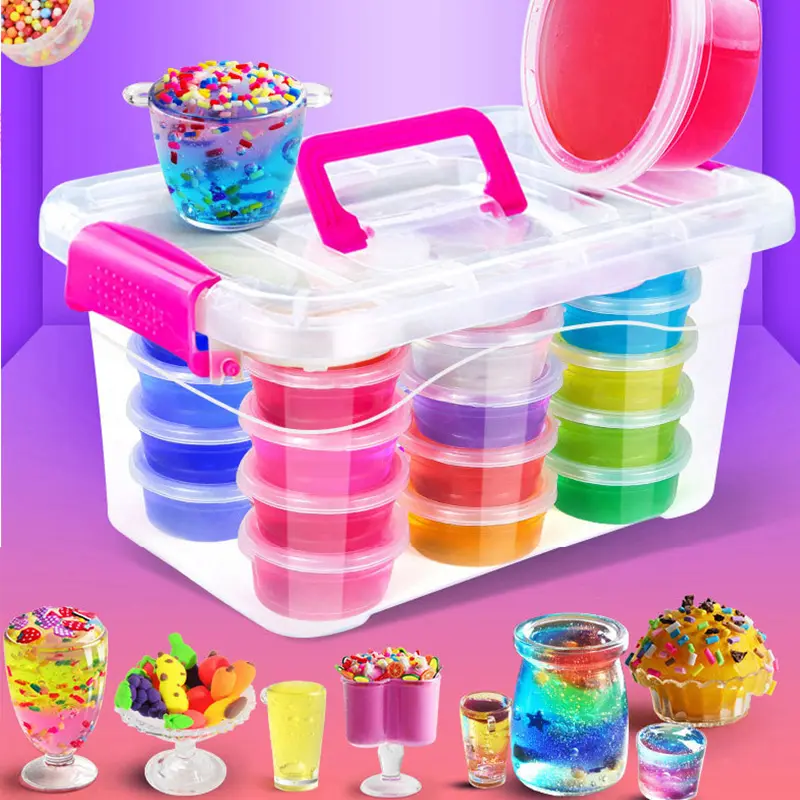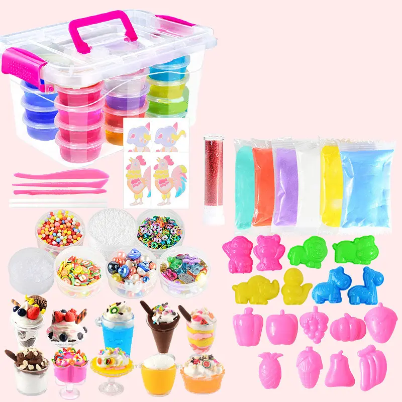 Zestaw do robienia glutów zawierający wielokolorowe slimy, brokat, piankowe koraliki, figurki zwierząt i plastikowy pojemnik.